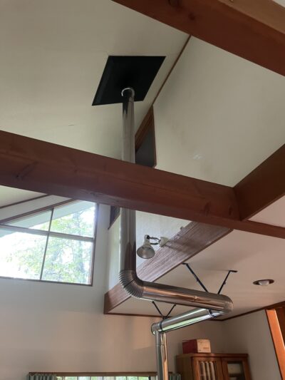 天井高のリビングにはストーブが設置されています